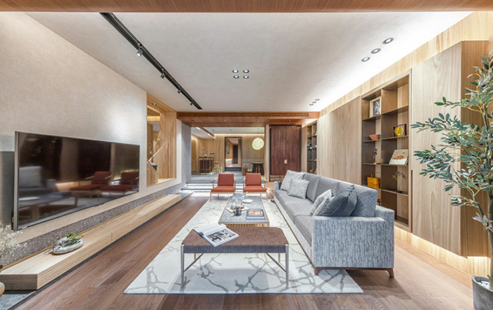 El diseño interior general de la residencia enfatiza la simplicidad y la comodidad. El suelo de la sala y el comedor están revestidos de mármoles blancos, que muestran sencillez. Las paredes están revestidas con grandes áreas de pintura artística de color blanco lechoso y chapas de madera de colores cálidos, para producir limpieza y el tono cálido del espacio.